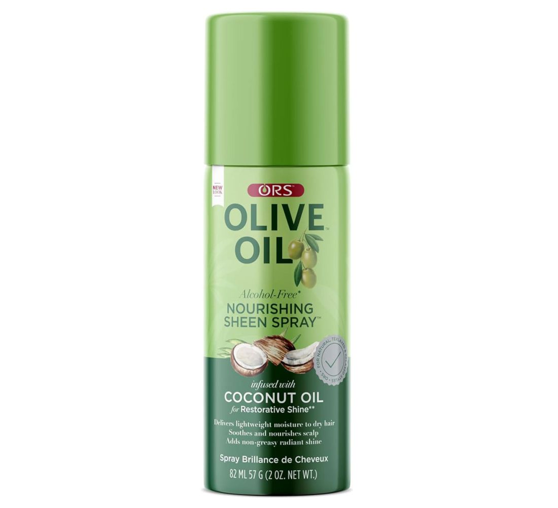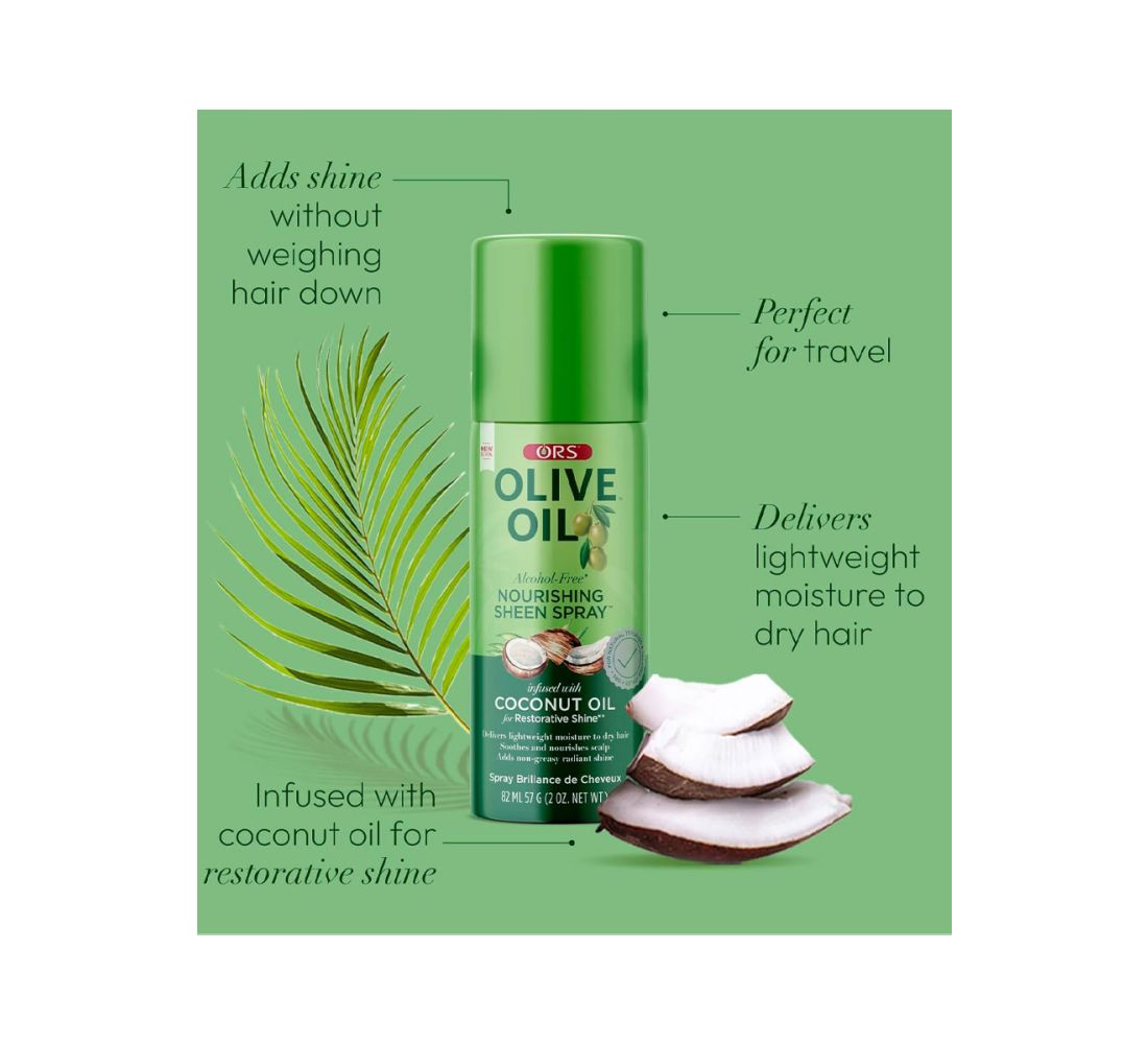 This lightweight Olive Oil Nourishing Sheen Spray with Coconut Oil add reflective shine without weighing hair down. Provides a non-greasy, satin finish while restoring the hair's natural moisture balance to tame flyaways and strengthens for superior-lasting sheen and frizz control.